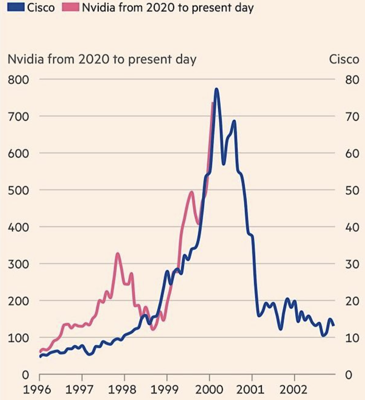 I saw this chart recently, comparing the historic stock price of Cisco vs NVIDIA. It made me think about selling my NVIDIA position that has almost tripled at this point.